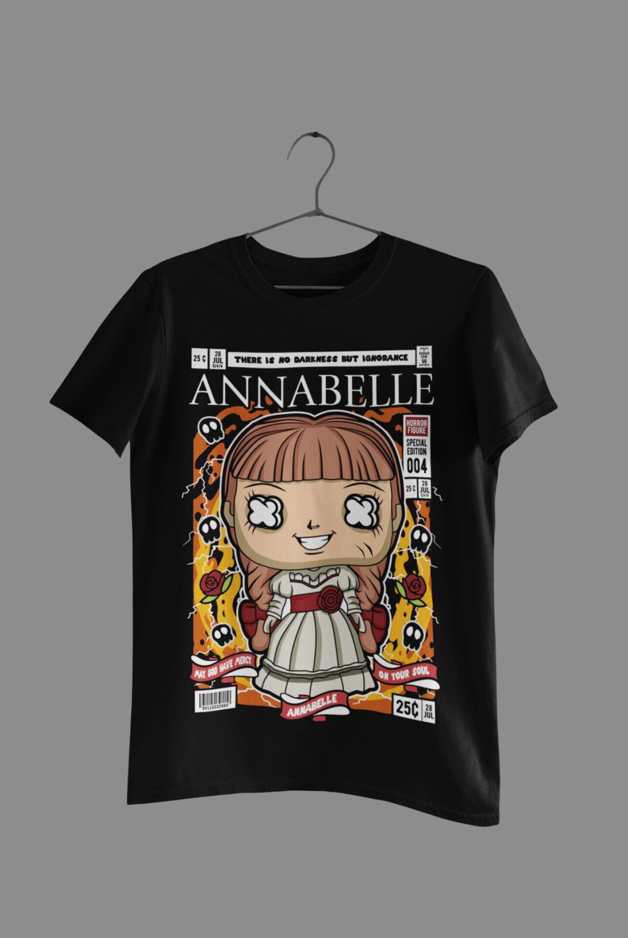 Buy the Pop Art Annabelle Cotton T-Shirt – a regular-fit, 100% cotton unisex tee with DTF printed horror-art graphics. Premium 180 GSM fabric ensures comfort, and 50-wash durability guarantees long-lasting quality. Perfect for horror lovers and streetwear enthusiasts!